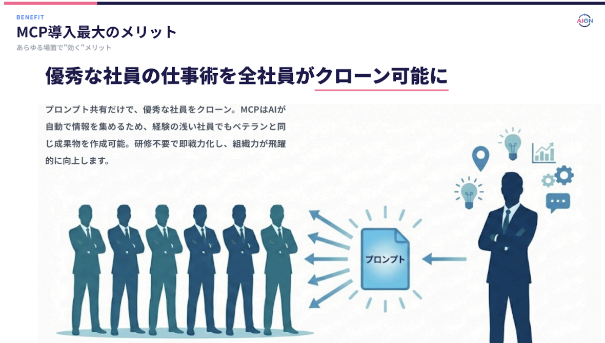 このスキル差の背景には、「どこにどのデータがあるか」「どのファイルを参照すべきか」といった属人的な知識の存在がありました。しかし、MCPによりAIが自動的にデータを取得できる環境では、優秀な社員が使用しているプロンプト(AIへの指示)を共有するだけで、経験の浅い社員でもベテランと同等の成果物を短時間で作成できるようになります。これにより、社員間のアウトプット品質のばらつきが解消され、組織全体の生産性が飛躍的に向上します。